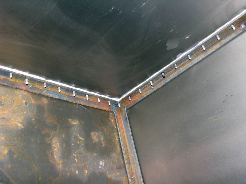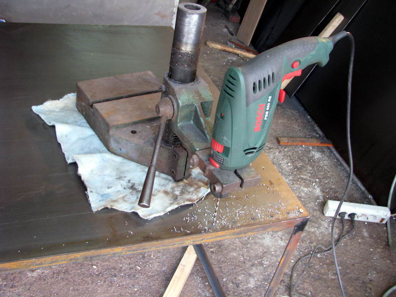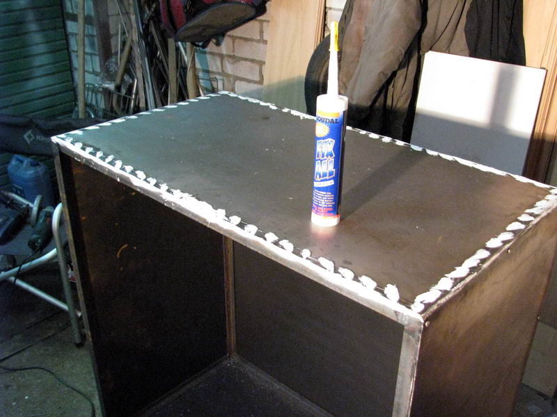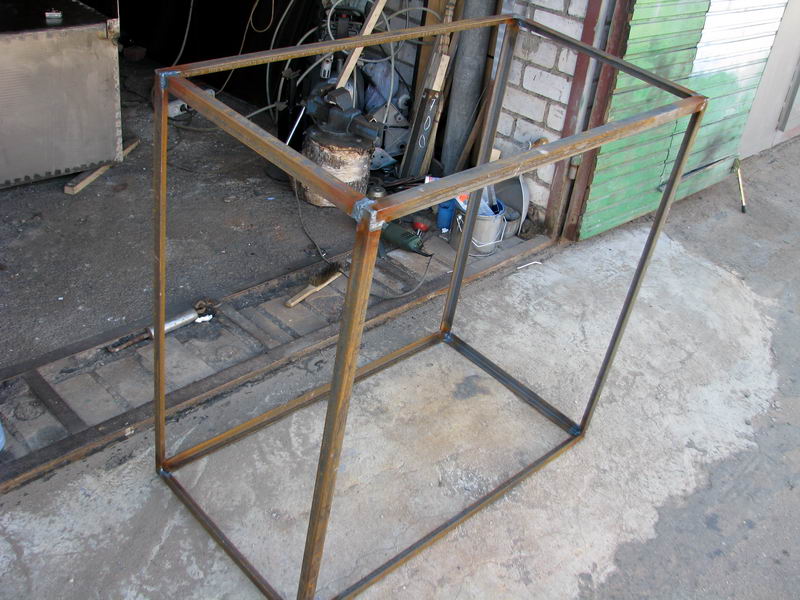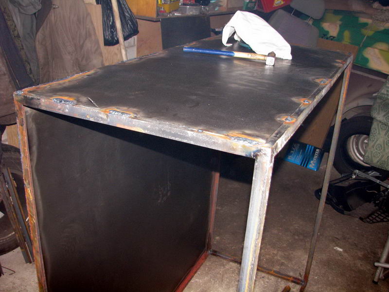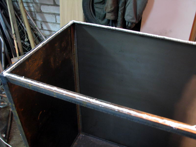 - только варю остов из уголка. Листы металла вырезаю по размеру и обшиваю им остов с посадкой на винты с потайными головками через каждые 4 см.