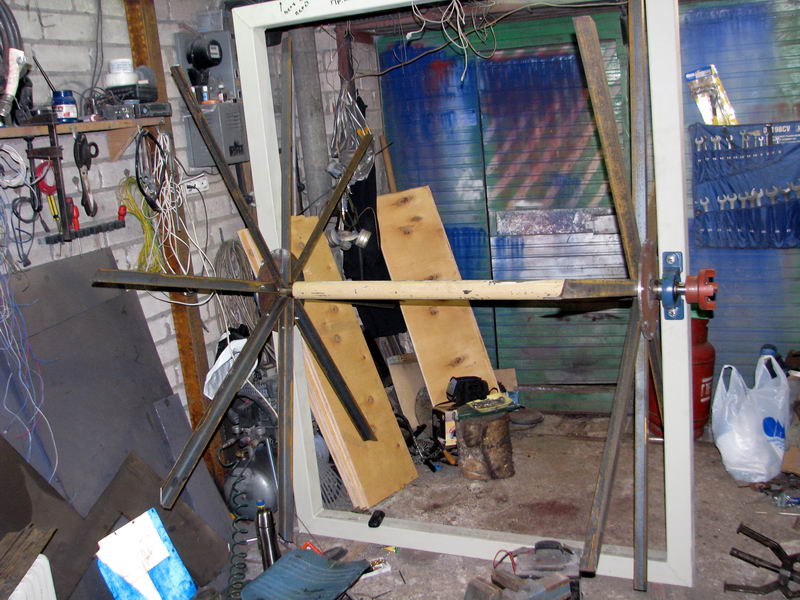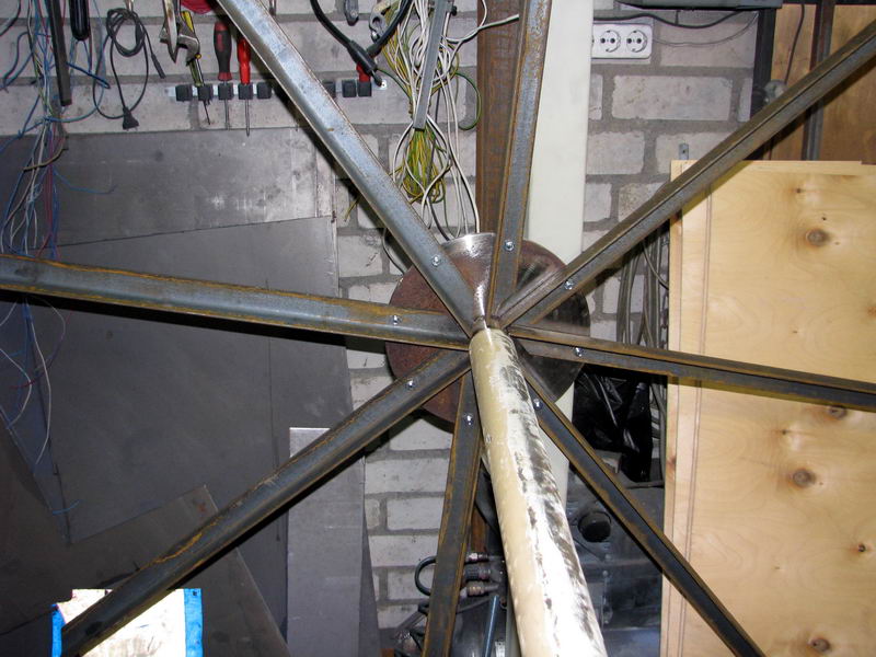Всё отцентровано на токарном станке. Спицы выполнены из уголка и крепятся к шайбам болтами. На последнем фото первая