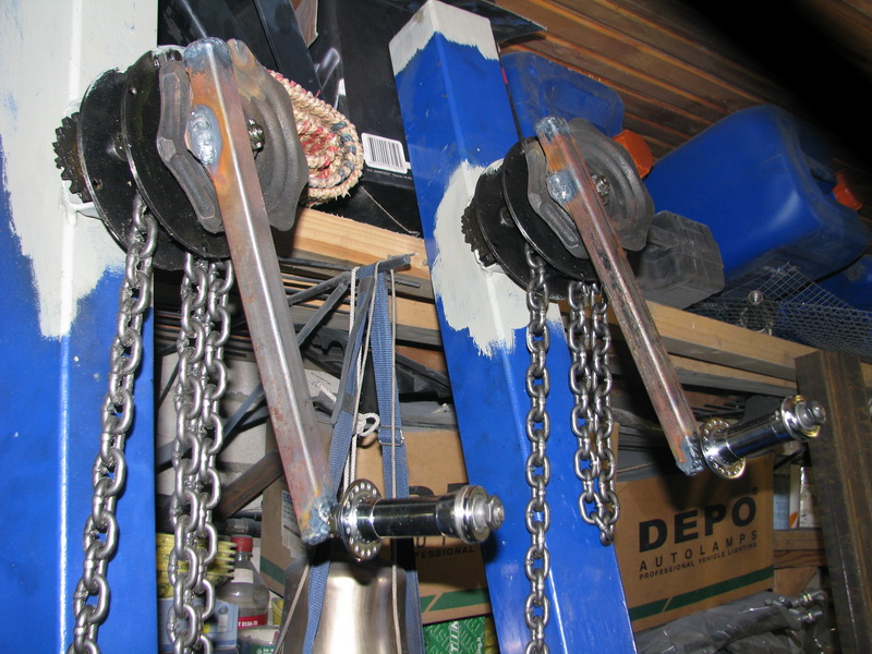 вертикальные профильные трубы (80х80х4). Около верхнего края этих труб приварены цепные тали в переделанном виде. Подъем и опускание рам с гребными