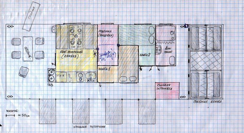 Площадь нижней палубы почти 50 кв.м. (про вторую палубу я пока не думаю, будет ещё время, позже) На такой площади можно